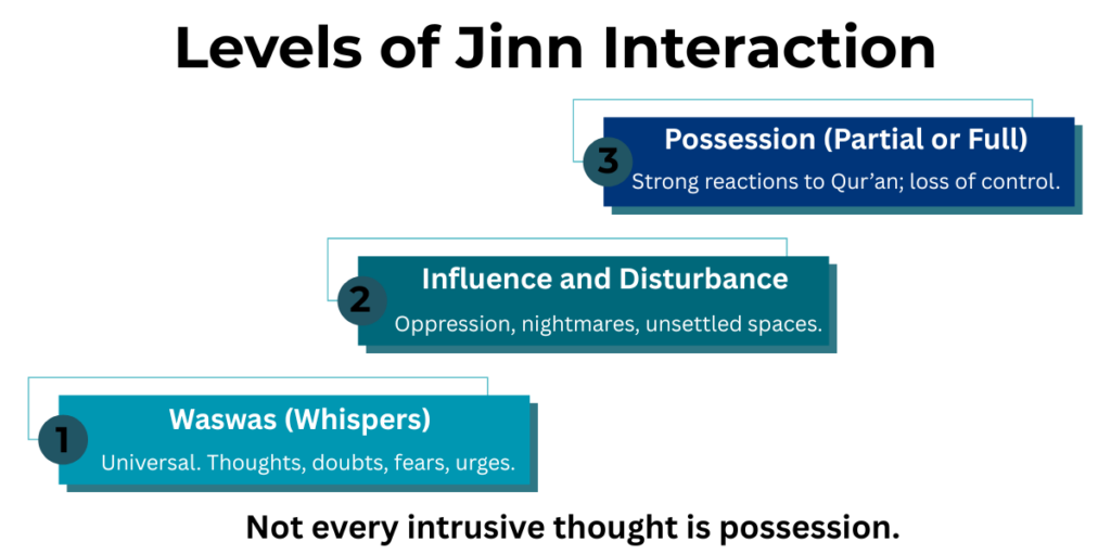 We can think of jinn interaction with humans on different levels. At the most basic level, there are whispers (waswas), which are universal. Every human experiences them. Shaytan suggests thoughts, doubts, fears and desires. He tries to colour how you interpret events and how you think about Allah, yourself and others. Not every intrusive thought is a sign of possession. Often it is “basic” waswas that needs spiritual and psychological tools, which we will discuss later.