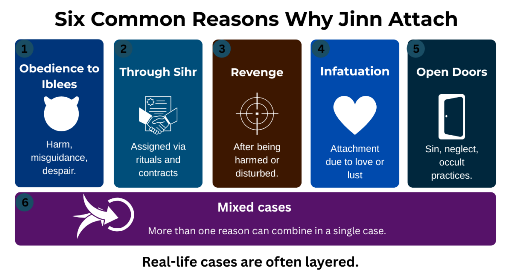 In reality, cases are often mixed. A jinn may originally come through sihr and later develop its own attachment or hatred over time. Or it may come for revenge and then be recruited into magic.